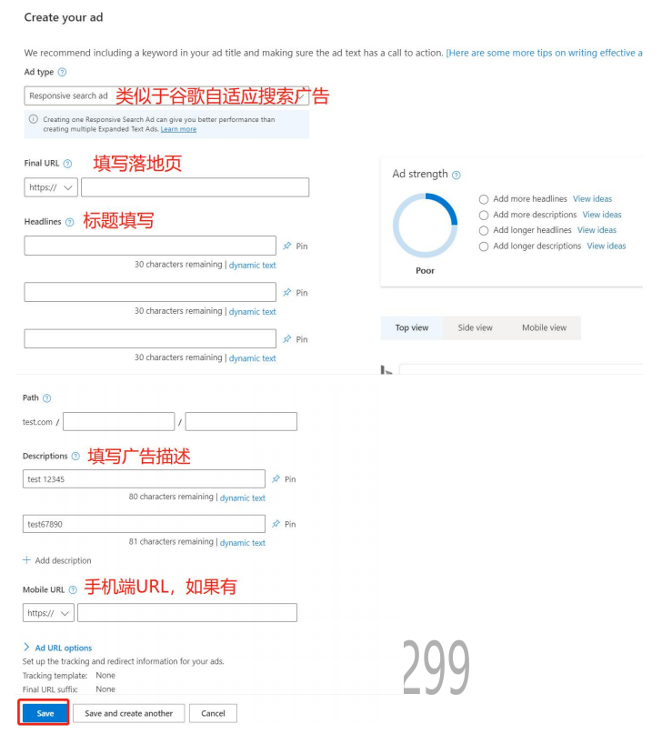 Step 6、选择广告类型,填写广告的落地页、标题、广告描述,保存广告后页面跳转到广告设置起始页;