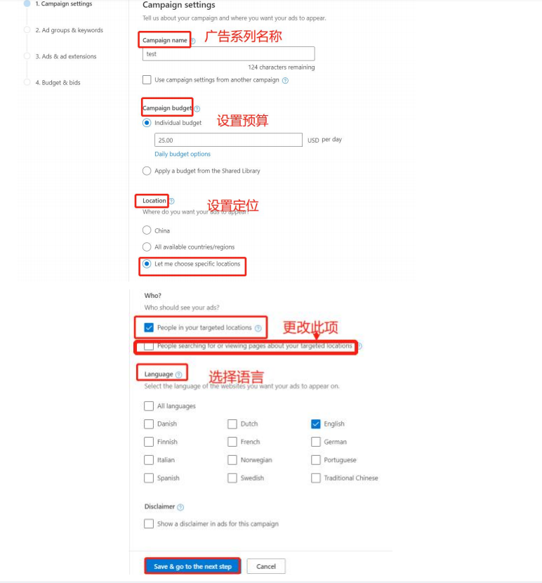 Step 3、设置广告系列的名称、预算、地理位置、地理位置选项、语言,保存并下一步;