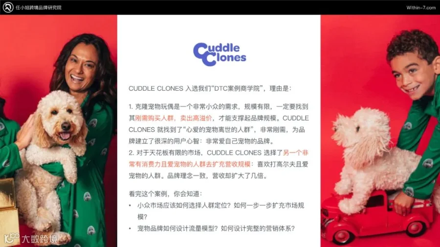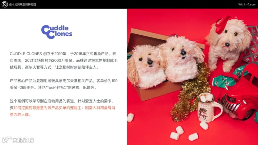 1. 克隆宠物玩偶是一个非常小众的需求,规模有限,一定要找到其刚需购买人群,卖出高溢价,才能支撑起品牌规模。CUDDLE CLONES 就找到了“心爱的宠物离世的人群”,非常刚需,为品牌建立了很深的用户心智:非常爱自己宠物的品牌。