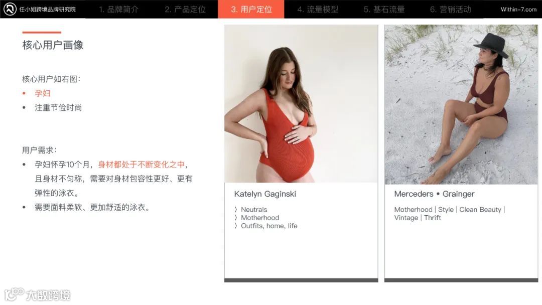 YOUSWIM找到了喜欢海边和游泳的孕妇,作为品牌的核心用户。孕妇作为一个泳装市场非常小众的一个人群,怀孕周期短,很多品牌都会忽略她们,自然竞争就很小。