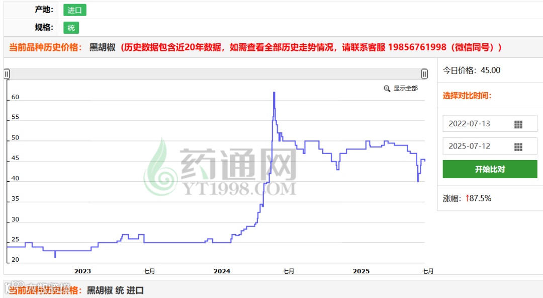 2024年上半年,黑胡椒结束长达7年的低价周期,价格从27元快速上涨至62元。尽管短期内涨幅迅猛,但高价未能持续,迅速回落至41元。经过市场逐步消化,2025年3-4月价格回升至48-49元;受贸易战及巴西增产等因素影响,6月再度回落至41元,近期小幅反弹至44.5-45元区间。