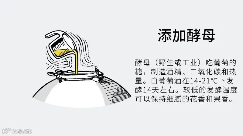 发酵一款白葡萄酒大约需要14天。为了保存精致的花香,白葡萄酒在比红葡萄酒更低的温度下发酵。