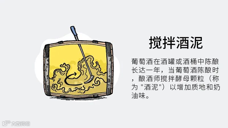 搅拌导致所有这些死的酵母颗粒,称为“酒泥”,漂浮到酒里。酒泥为葡萄酒增加了味道(味道有点像啤酒或面包),它还使葡萄酒具有更多的奶油质地。