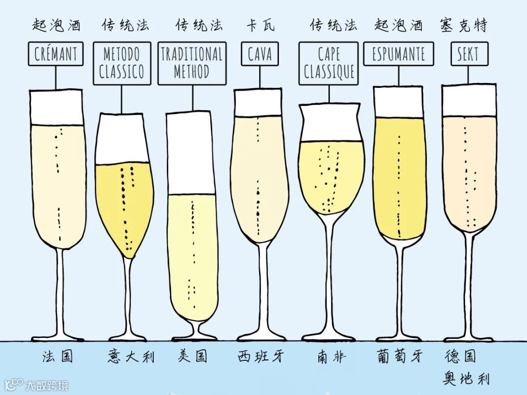 在法国和世界其他地方还有很多其他高品质的起泡酒。以下是以传统香槟风格酿制的起泡酒的产区以及对应的起泡酒类型: