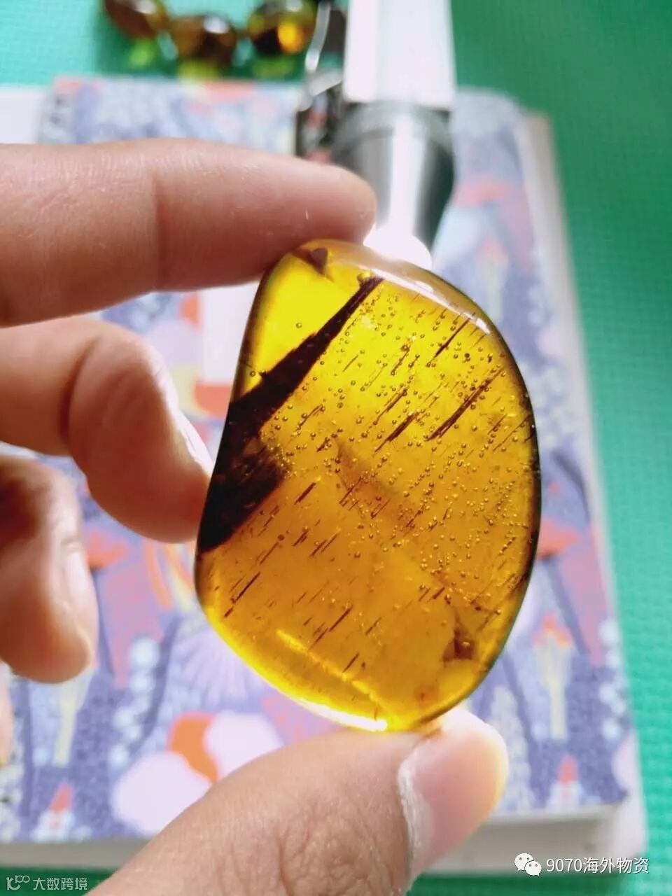 金棕植物珀 有一层的小气泡 聚集在背后一层,很有立体感 ,非常漂亮,很难得, 一截植物寓意横财(横柴),植物微出皮 无坑 微微小冰尺寸55*37*10 重13克