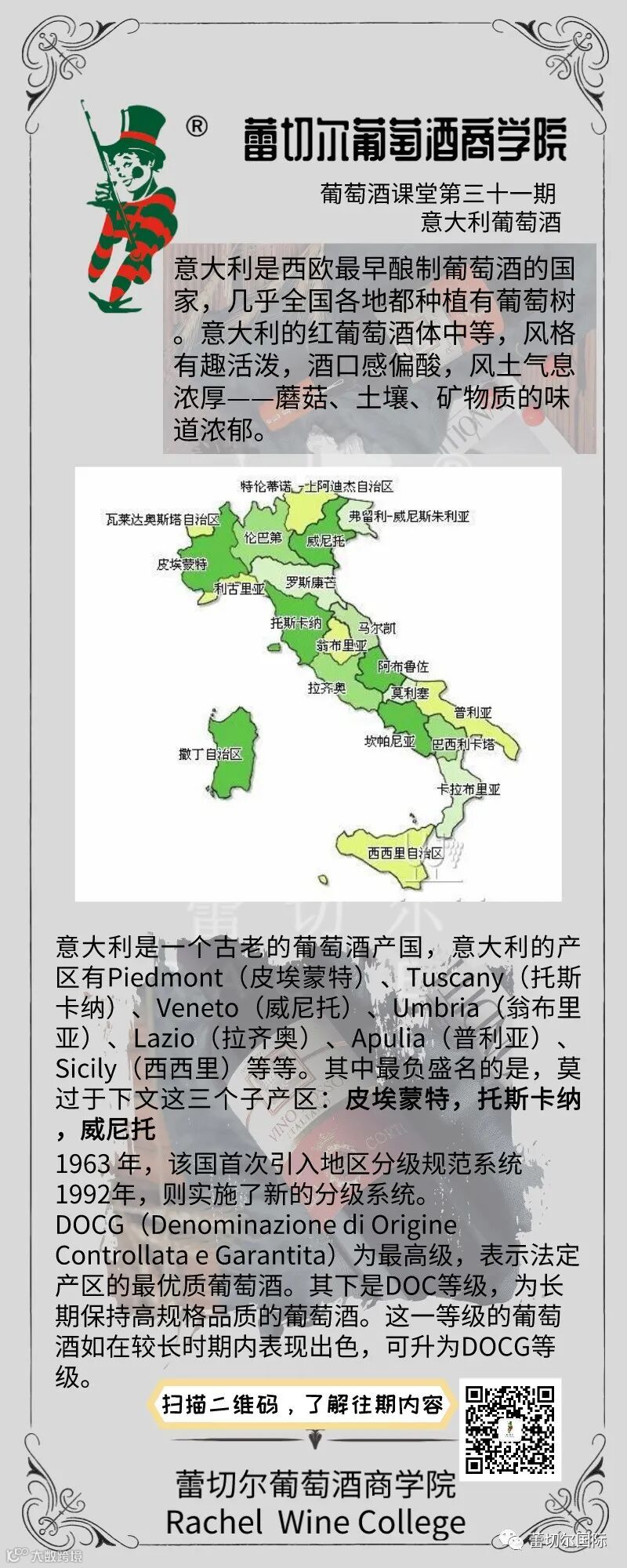 意大利是一个古老的葡萄酒产国,意大利的产区有Piedmont(皮埃蒙特)、Tuscany(托斯卡纳)、Veneto(威尼托)、Umbria(翁布里亚)、Lazio(拉齐奥)、Apulia(普利亚)、Sicily(西西里)等等。其中最负盛名的是,莫过于下文这三个子产区:皮埃蒙特,托斯卡纳,威尼托