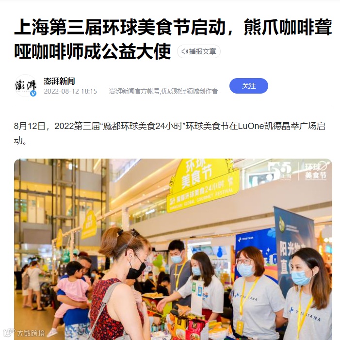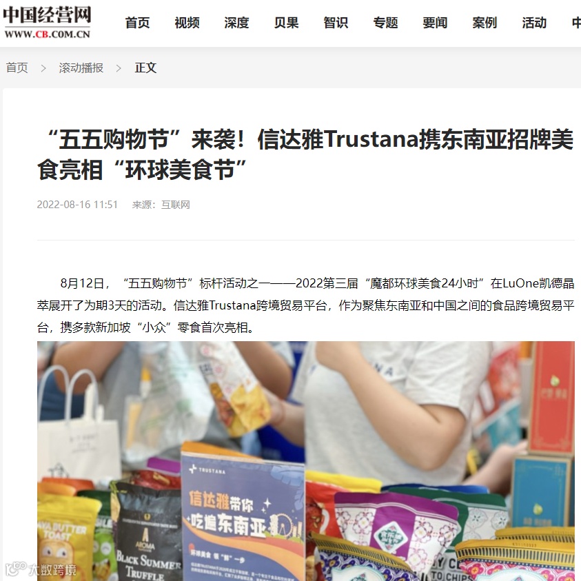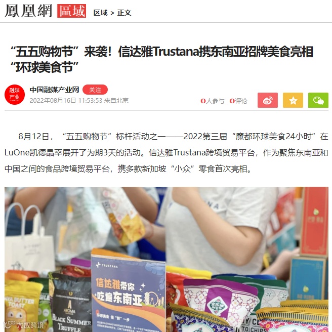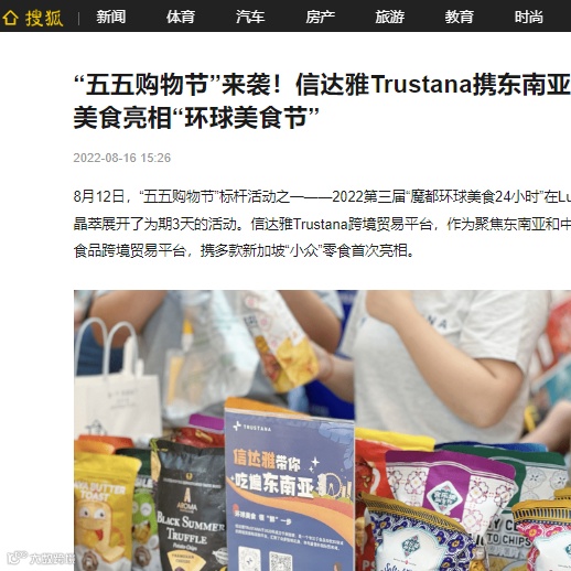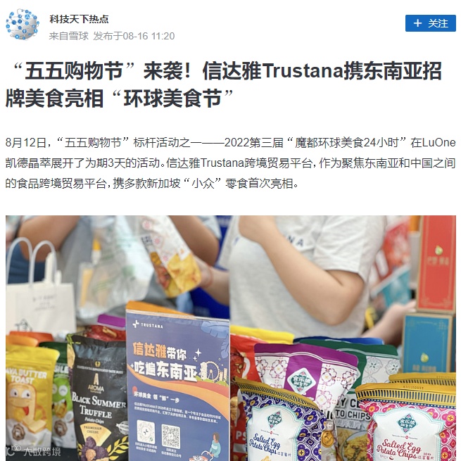8月12日, “五五购物节”标杆活动之一——2022第三届“魔都环球美食24小时”在LuOne凯德晶萃展开了为期3天的活动。信达雅Trustana跨境贸易平台,作为聚焦东南亚和中国之间的食品跨境贸易平台,携多款新加坡“小众”零食首次亮相。