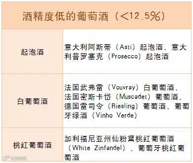 大部分酒精度低于10%的葡萄酒,特点是酒体轻盈、口感偏甜,意大利的阿斯蒂莫斯卡托(Moscato d'Asti,酒精度5.5%)和德国的珍藏雷司令(Kabinett Riesling,酒精度8%)是这类型的典型代表。
