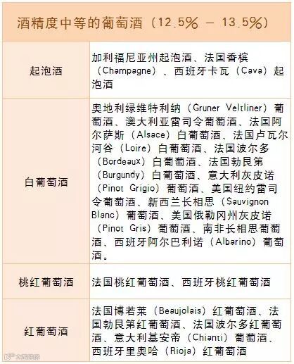 酒精度介于10~11.5%的葡萄酒通常使用相对不那么甜的葡萄酒酿制而成。在法国、意大利北部和德国等气候凉爽的地区,中低酒精度葡萄酒比较常见。