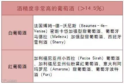 高酒精度葡萄酒通常有两种,一种是自然酿造的,如部分加州仙粉黛和澳洲西拉等,另一种则是加强型葡萄酒。加强型葡萄酒是用高酒精度的烈酒加入到已经发酵完成的葡萄酒或者发酵中的葡萄汁中,从而得到带有不少残糖、同时酒精度又比较高的葡萄酒。雪利酒、波特酒和马德拉等都是非常常见的加强型葡萄酒,它们的酒精度往往在20%左右。