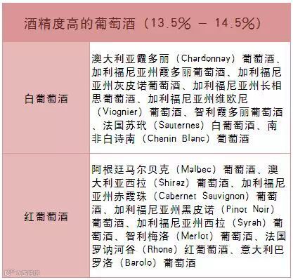 影响葡萄酒酒精度的因素有很多,主要有以下几个:葡萄品种和风格、品质水平、葡萄产区的气候条件等。假如我们不考虑不同酒庄的品质水平,仅考虑品种和产区的话,依据酒精度高低我们可以将葡萄酒分为以下类别: