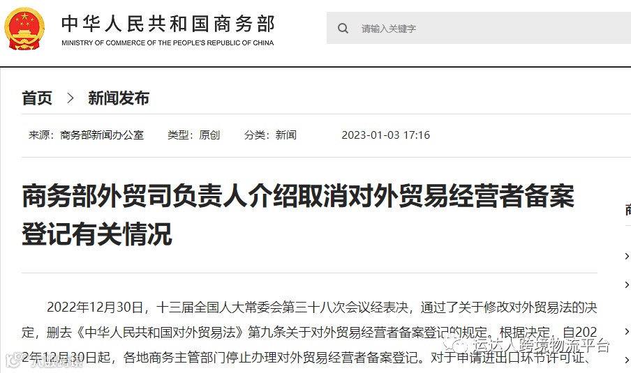 1月3日,据商务部消息,2022年12月30日,十三届全国人大常委会第三十八次会议经表决,通过了关于修改对外贸易法的决定,删去《中华人民共和国对外贸易法》第九条关于对外贸易经营者备案登记的规定。根据决定,自2022年12月30日起,各地商务主管部门停止办理对外贸易经营者备案登记。