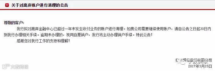 招商银行曾在今年3月发布过《关于对离岸账户进行清理的公告》: