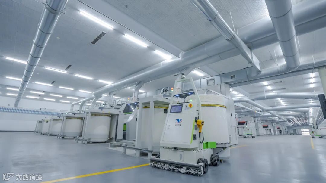步入江苏悦达纺织集团有限公司的10万锭绿色智能工厂,看不到忙碌的织工,目之所及是机器人和智能轨道组成的“主角”。在这座智能工厂内,共有430多台数字化设备、41台AGV、32公里智能传输线、30多万只带芯筒管等,自动换筒、换卷、运输、成包及在线监测等新技术的应用,大幅提高纱线产能与生产效率,将万锭用工(1万锭纱线的用工)从55人缩减到15人,生产效率提高近30%,综合能耗下降10%以上,加工成本下降近23%。