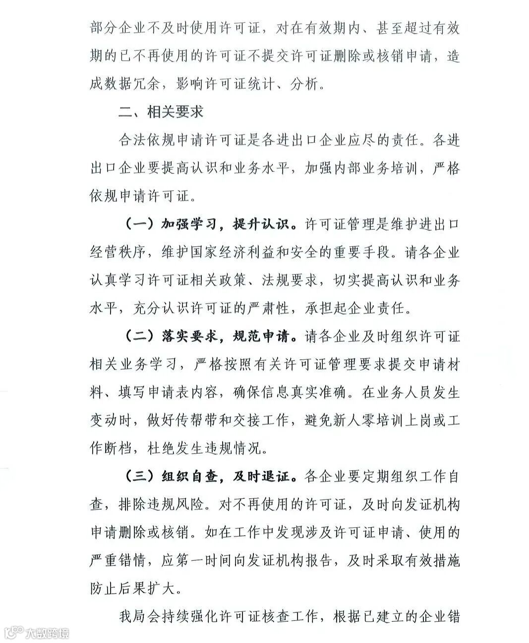 加强学习,提升认识:各进出口企业应认真学习许可证相关政策、法规要求,提高认识和业务水平,充分认识许可证的严肃性,承担起企业责任。
