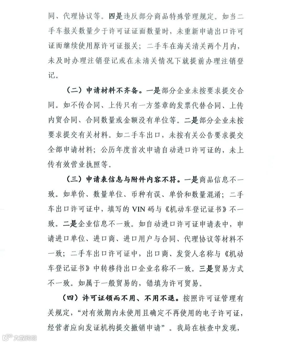 据许可证局通报,近期在许可证核查工作中,部分进出口企业在二手车出口许可证的申请、使用环节存在明显问题。主要问题包括: