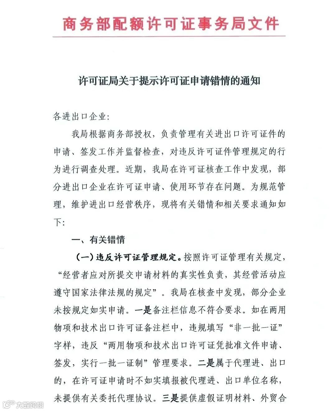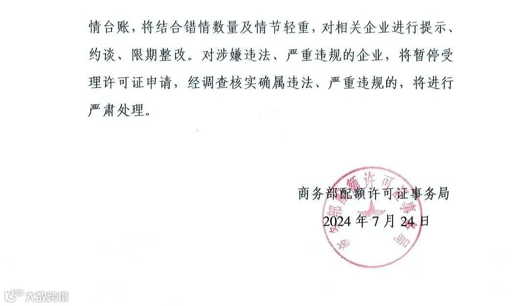 许可证局表示,将持续强化许可证核查工作,根据已建立的企业错情台账,结合错情数量及情节轻重,对相关企业进行提示、约谈、限期整改。对涉嫌违法、严重违规的企业,将暂停受理许可证申请,经调查核实确属违法、严重违规的,将进行严肃处理。