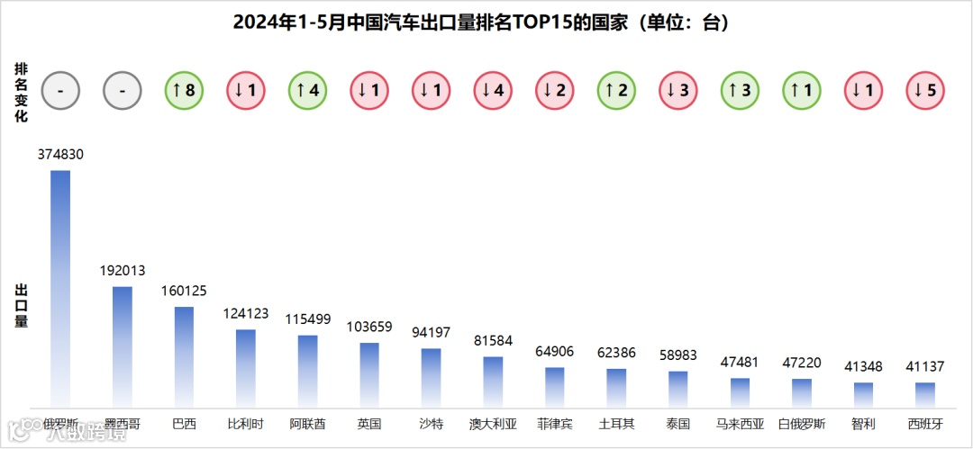 从汽车出口销量前15名的市场来看,俄罗斯、墨西哥、巴西等国稳居前列,而新能源领域则涌现出印度、乌兹别克斯坦等新兴市场。