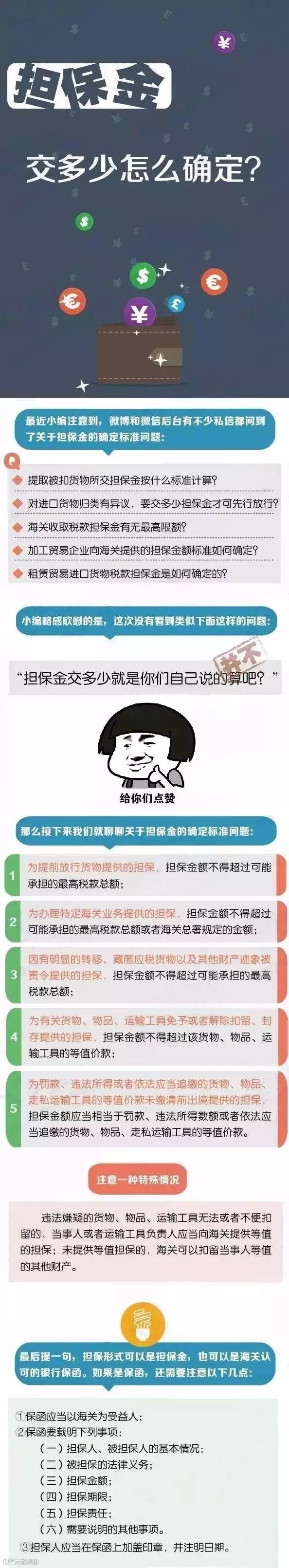 关于“担保金确定标准”的问题,例如“海关收取税款担保金有无最高限额?”“提取被扣货物所交担保金按什么标准计算?”......还有很多类似问题,小编今天统一答复给大家,详见下图