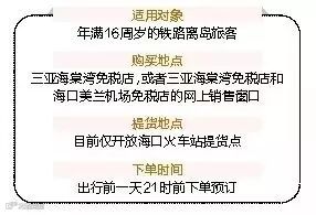 15日起,年满16周岁的铁路离岛旅客凭个人离岛车票及有效身份证件,可以在三亚海棠湾免税店或者通过三亚海棠湾免税店和海口美兰机场免税店的网上销售窗口购买免税商品。离岛时凭本人火车票、购物凭证、身份证件等在海口火车站提货点提取所购免税商品并携带离岛;同一旅客在同一年度内乘飞机和乘火车免税购物合并计算,且不得超过离岛免税政策的额度限制规定。