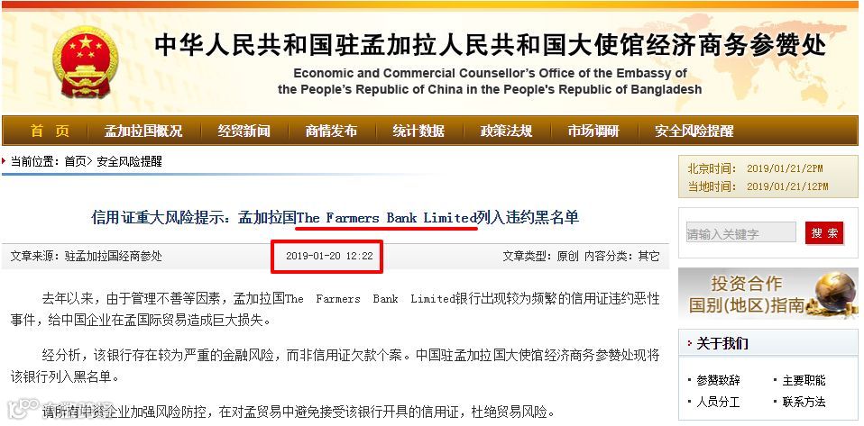 经分析,该银行存在较为严重的金融风险,而非信用证欠款个案。中国驻孟加拉国大使馆经济商务参赞处现将该银行列入黑名单。