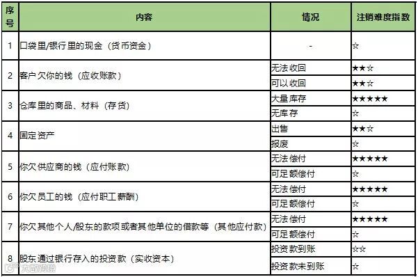 很多中小企业的管理者大多数没有学过财务专业知识,为了能够让大家更好的理解,会计专业名词我会全部去掉,我会用最简单,最直接的方式,让你理解,到底账上的哪些数据影响了企业的注销。先来看下方的表格,根据难度指数,☆表示简单、★表示难,★的数量越多,难度就越大。