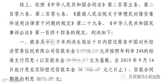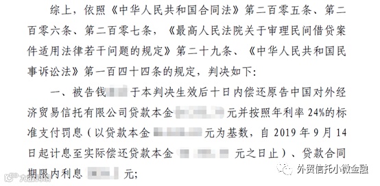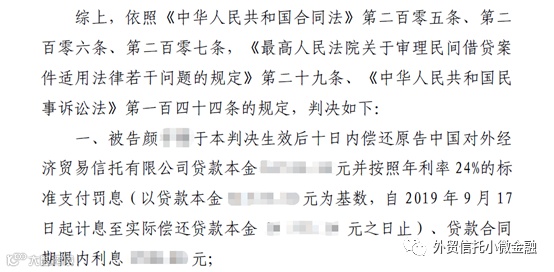 中国对外经济贸易信托有限公司(以下简称原告)与汇金29号3名被告借款人钱某、颜某、吴某(以下简称被告)金融借款合同纠纷案,已经于本月依法进行简易程序,公开开庭进行了审理,现已审理终结。根据判决书以上被告应按照前述合同约定偿还贷款本息、罚息及原告为实现债权支付的诉讼费、保全费、公告费、律师费等费用。3人依法缺席审理。以上被告可以于15日内上诉,15日内未上诉判决生效,生效后依照判决10日履行裁判文书义务,如不履行我司可申请强制执行。
