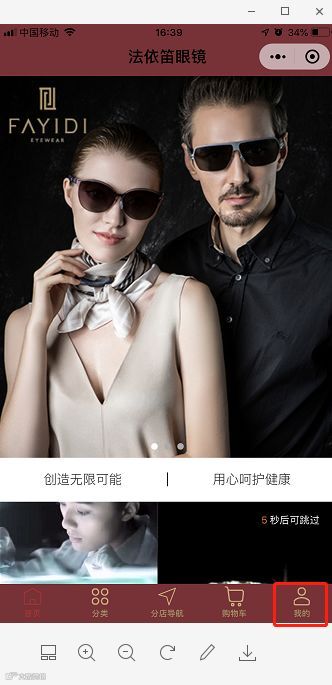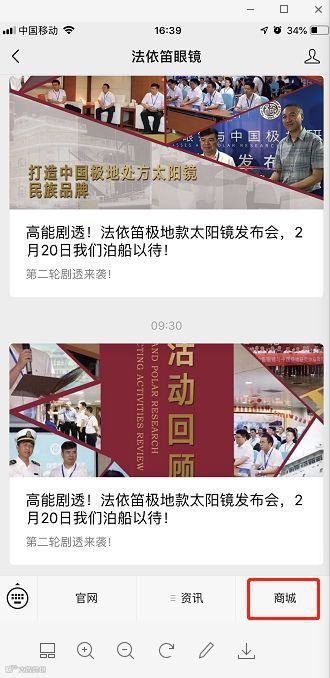 进入“法依笛眼镜”微信公众号,点击公众号右下角“商城”。