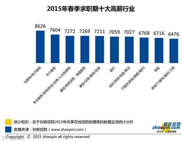 互联网/电子商务行业以8626元的月薪高居榜首,其次是中介服务业紧随其后,约7604元;再次是专业服务/咨询(财会/法律/人力资源等),平均月薪为7272元。互联网/电子商务行业月薪的增长,得益于行业前景看好,行业规模不断扩大,因此职位机会不断增加的现实。专业服务/咨询(财会/法律/人力资源等)行业以工作压力巨大但待遇优渥而闻名,中介服务行业虽然不受求职者青睐,位居最冷门行业排行榜的第二位,但其薪酬水平却高居行业榜单第二位。