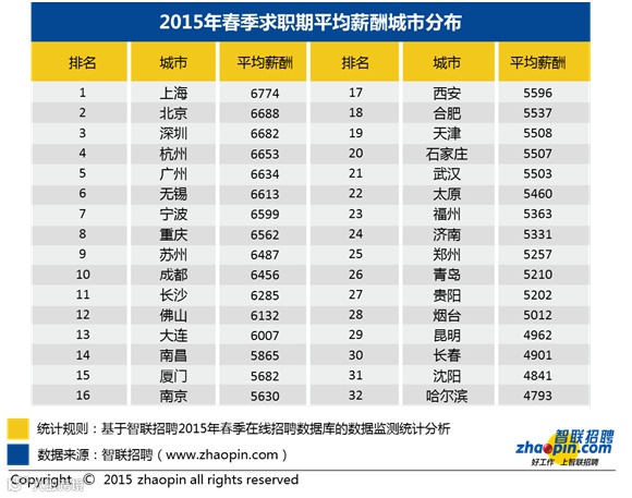 智联招聘在线数据显示,从2015年春季各城市的薪酬水平来看,上海以6774元的月薪高居中国各城市薪酬排行榜榜首,略领先于位居第二位的北京(6688元),深圳以6682元的月薪位居第三位。其后均为东部沿海城市,如杭州、广州、无锡、宁波等,均位于长三角、珠三角经济圈辐射范围内。长春、沈阳、哈尔滨这三大东北城市位居榜单最末位。