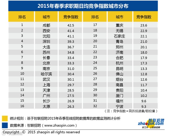 从各城市竞争指数来看,成都以42.5的竞争指数高居榜首,其次是西安,竞争指数为41.4;沈阳以41.1的竞争指数位居第三。从总体来看,春季职位竞争指数位居前10位的城市主要分为三类:二线城市城市,如成都、西安、大连、苏州、南京;东北城市,如沈阳、长春、哈尔滨;一线城市,如深圳、北京。