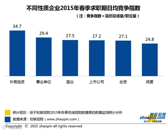 春季求职期外商独资企业竞争指数最高,为34.7,竞争最为激烈,其次是事业单位(29.4),再次是国企,竞争指数为27.5。外企、事业单位和国企能够提供的职位数量有限,而这些职位对求职者吸引力较高。民营企业竞争情况相对较弱,竞争指数最低,为24.8,由于民营企业的企业知名度、薪酬福利、企业文化等方面相对来说弱于国企、外企和上市公司,因此对求职者的吸引力较弱,竞争指数较低。