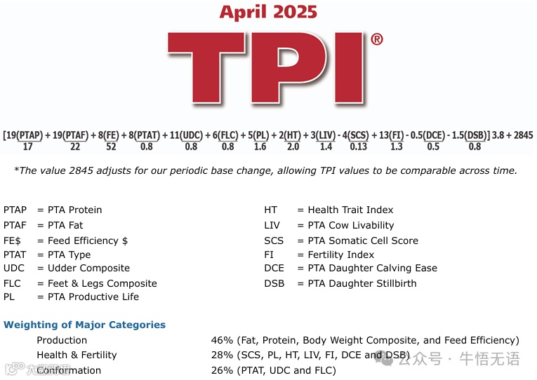 2025 年 4 月的 TPI 公式更新是对 2021 年版本的重大改进,核心在于饲料效率 (FE) 指数公式的调整。 PTA Milk 系数由正转负,反映了经济模型和育种策略的转变,更加强调奶酪市场导向、饲养成本控制以及牛奶成分的价值。 虽然主要类别权重、预期结果以及其他综合指数 (FI, HT) 的公式保持不变,但 奶农在使用 2025 年 TPI 公式进行育种决策时,需要更加关注提高乳脂和乳蛋白产量,以及通过饲料节省来提高饲养效率,而不是单纯追求牛奶总量的增加。 理解这些变化对于奶农有效利用 TPI 公式选育更具盈利能力的下一代奶牛至关重要。