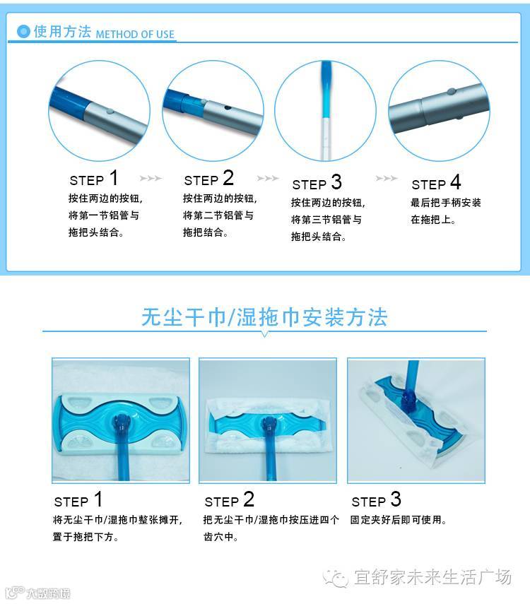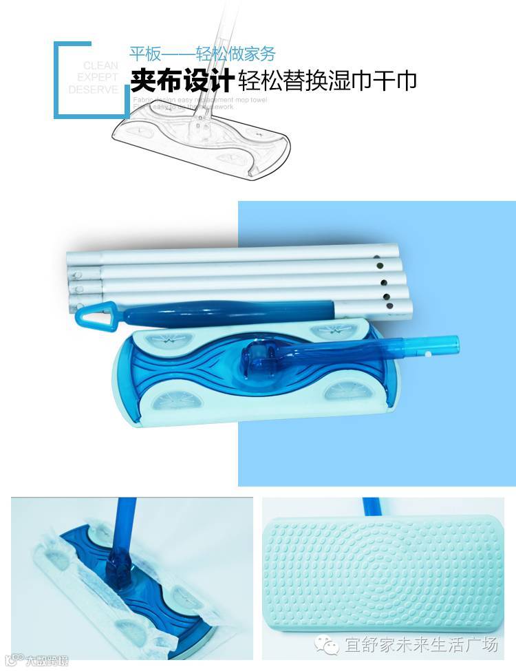 宜舒家静电拖把不仅解决了传统拖把需水洗沥干的烦恼,还解决了老式拖把无法一次性拖净地面的麻烦,创新的夹布设计能随意替换湿巾、干巾,轻松实现用完一张丢一张,再也不用洗拖把。
