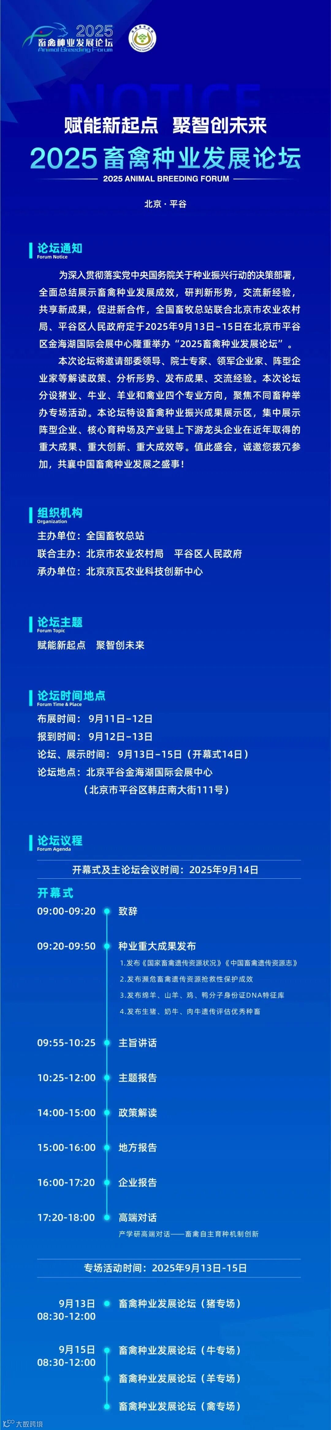 9月13-15日,2025畜禽种业发展论坛将在北京召开。该论坛由全国畜牧总站主办,邀请部委领导、院士专家、领军企业家、阵型企业家等解读政策、分析形势、发布成果、交流经验。