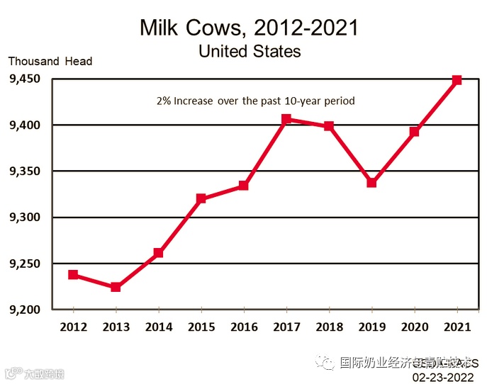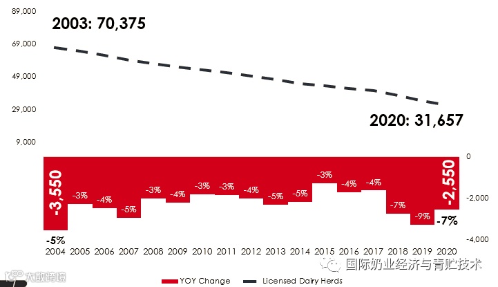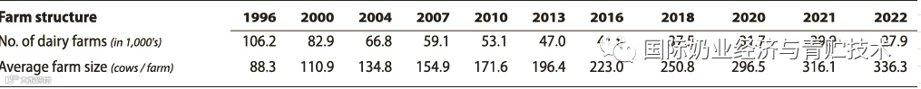 美国奶牛场数量稳步逐年减少,从1996年的10万个奶牛场,2013年减少到5万个以下,2021年低于3万个牧场,2022年只有27932个奶牛场,一般年份每年约3%的牧场退出,效益差的年份牧场退出的比例可高达5%甚至7%,比如2004年和2018年到2020年的三年都是牧场不景气年代。