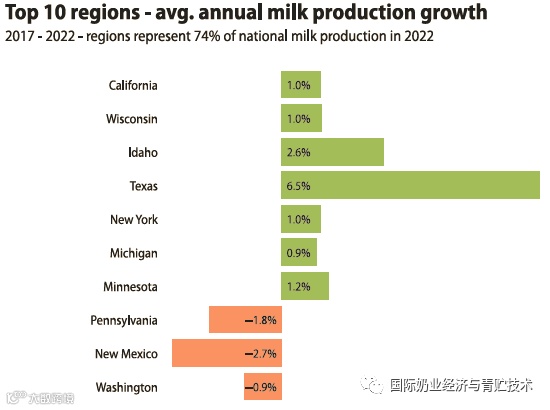 前十大州占美国牛奶总产的74%,过去5年德州牛奶年均增长最快达6.5%,超越了纽约州(年均增长1%)。美国还统计前24州牛奶主产州,占美国全部奶牛存栏的94-95%。