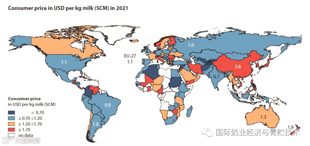 美国奶农获得的奶价占消费者奶价的39%,欧洲国家整体也是如此,但中国奶农获得的奶价,从原奶角度看,已经是世界高奶价国家,这主要是由于我国土地和水资源不足,玉米价格高造成的。但我国作为人均收入或人均GDP刚刚达到1万美元,与发达国家人均3-5万美元GDP国家相比,我国消费者奶价是欧美国家的3倍以上。即欧美国家消费者支付的牛奶价格平均在1.1美元每公斤标准乳,中国消费者支付的价格是3.6美元(按2021年美元人民币汇率6.5计算合每公斤牛奶23.4元)。
