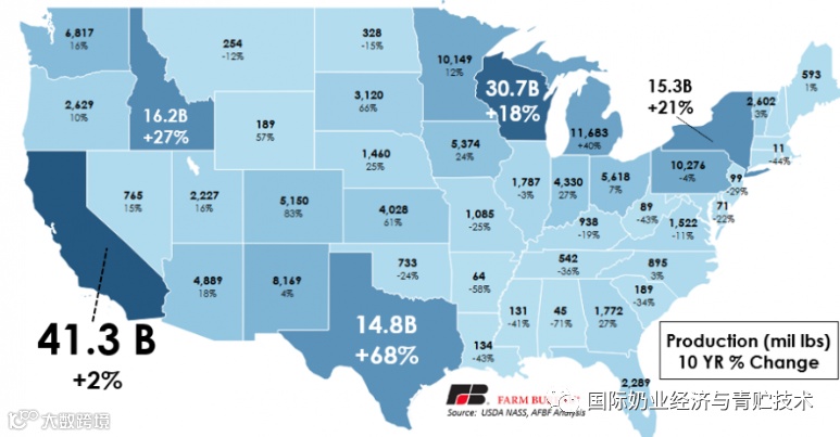 18世纪纽约州是美国第一大奶业州,19世纪后威斯康辛成为美国第一大奶业州,20世纪加利福尼亚州成为美国第一大奶业州。进入21世纪美国西部奶业崛起,爱达荷州(66万头)成为第三大奶业州,德克萨斯州(65万头)成为美国第四大奶业州,加州(172万头成乳牛)和威斯康辛州(126万头)仍为第一和第二大奶业州,而纽约州(63万头)成了第五。两强州地位稳固,保持遥遥领先,其后三州奶牛头数基本接近在65万头左右,属于第二梯队。第三梯队是美国中西部和东北部传统奶业州即宾夕法尼亚州、明尼苏达州和密歇根州。