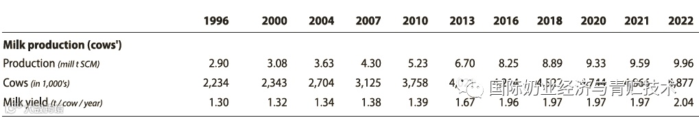 2022年美国牛奶产量1.03亿吨乳固体校正乳(SCM),全美奶牛场成乳牛头数939.3万头,从2016年以来奶牛总存栏头数基本稳定在930万头左右,美国奶牛成乳牛存栏最高峰的年奶是1930年左右将近2500万头,此后总体逐年下降,2010年奶牛总数位于最低谷在912万头,此后有所增加,在2021年达到944万头。而美国奶牛平均单产在逐年稳步提升,从1996年成乳牛单产6.9吨到2013年的9.3吨,2018年超过10吨,2022年达到11吨。牛奶总产量从2000年的7000万吨,2010年超过8000万吨,2016年超过9000万吨,2021年超过1亿吨,彰显了美国牛奶生产的潜力。