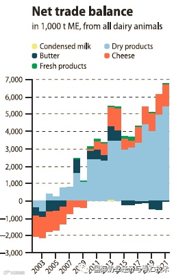 2006年以前美国是乳制品净进口国,2007年以后美国稳步成为乳制品净出口国,且出口量逐年上升。年净出口量约合680万吨原奶(中国年净进口量约合1500-1600万吨原奶)。