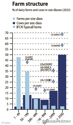 伴随着牧场数量的不断减少,是活下来的牧场规模越来越大。平均奶牛场成乳牛存栏头数从1996年的88头,发展到2000年的111头,2016年的223头,2021年超过300头,2022年平均牧场成乳牛头数336头。49头以下的家庭小牧场总存栏占比从过去的15%到如今的不到3%,但牧场数占全美的牧场数仍接近一半(47%); 而存栏2500头成乳牛以上的牧场占总存栏的比例从2006年的20%发展到如今的50%,但牧场数占总奶牛场的数目不到4%。