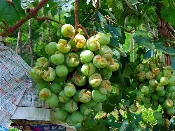 果实套袋前:要对幼穗进行一次蘸药处理,主要预防套袋后在袋内发生灰霉病、白腐病、炭疽病。常用的药剂是嘧霉胺加世高(苯咪甲环唑)和展布剂。