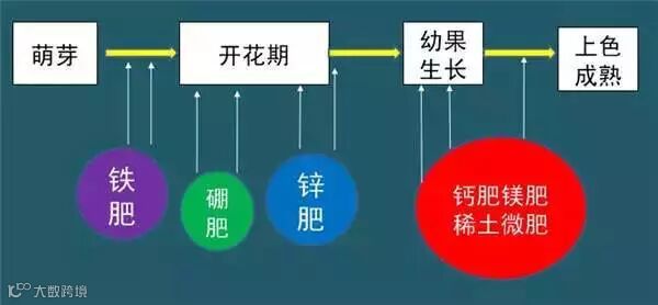 在上一年采收后施好底肥和当年壮芽肥的基础上,临界期的施肥重点抓好微量元素肥、钙肥和膨果肥的应用。重视开花前施用铁肥防黄化病,初花和盛花期喷硼肥,幼果膨大期水肥一定要跟上,尤其要重视喷施锌肥与钙肥。