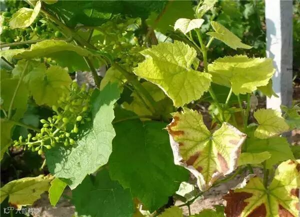 症状:葡萄缺铁首先出现嫩梢和幼叶的叶肉黄化,最后整个叶片和花序都呈现黄白色。在碱性土壤上缺铁症状最为明显。