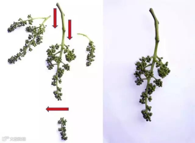 巨峰系品种花序修剪——园锥形果穗(1、去除副穗;2、去除上部分枝;3、掐去花序尖部。保留16个小花穗)