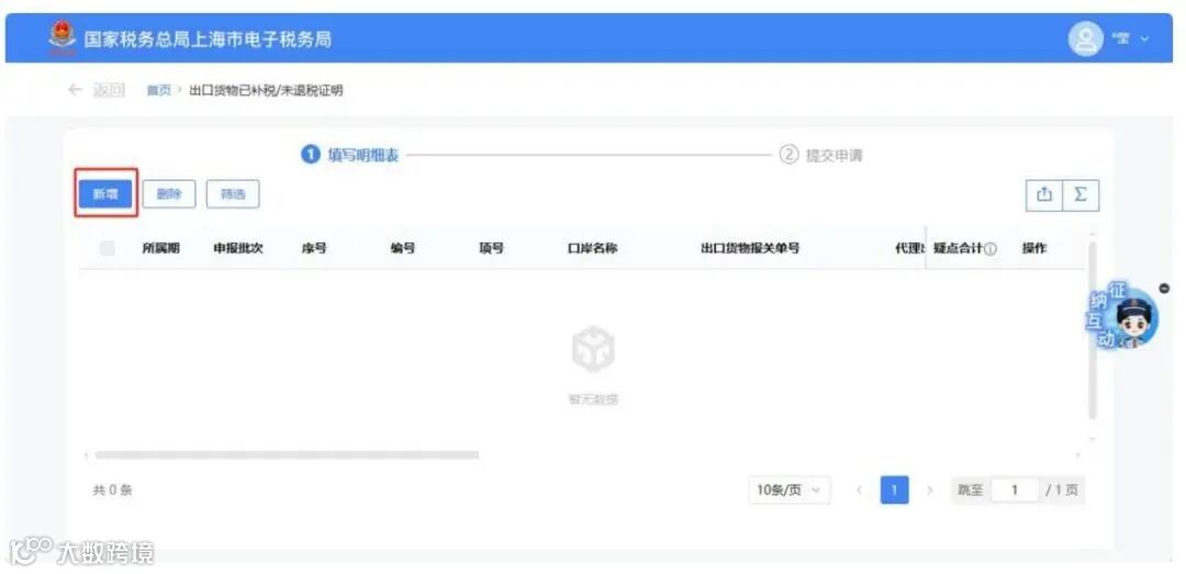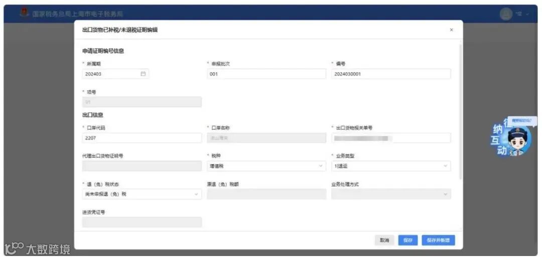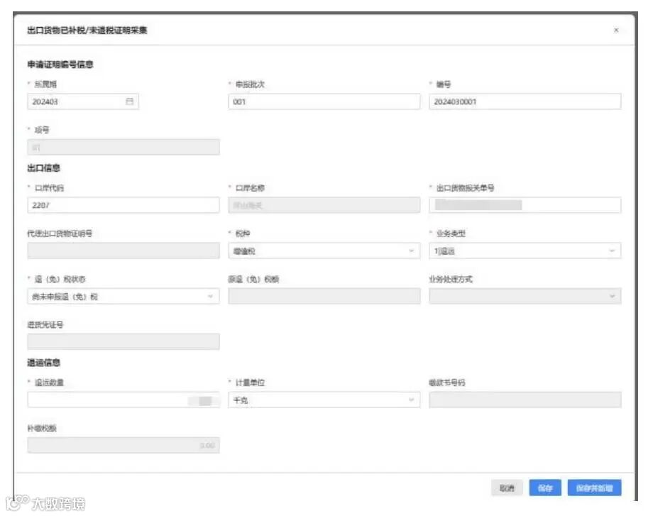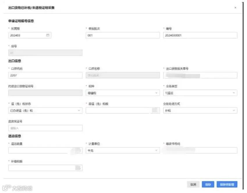 点击【新增】按钮,弹出“出口货物已补税/未退税证明采集”页面,可根据系统提示录入相关信息,进行申请信息采集。