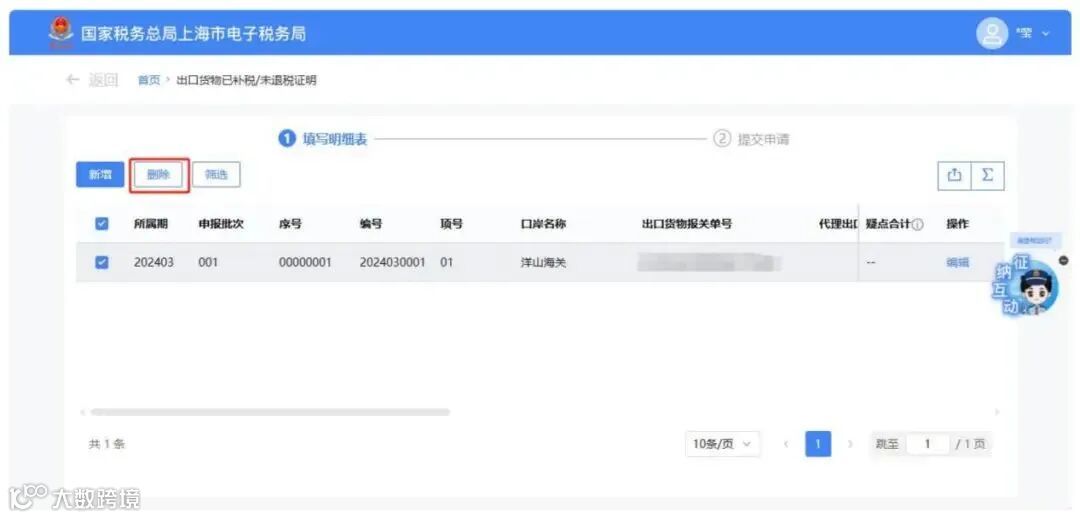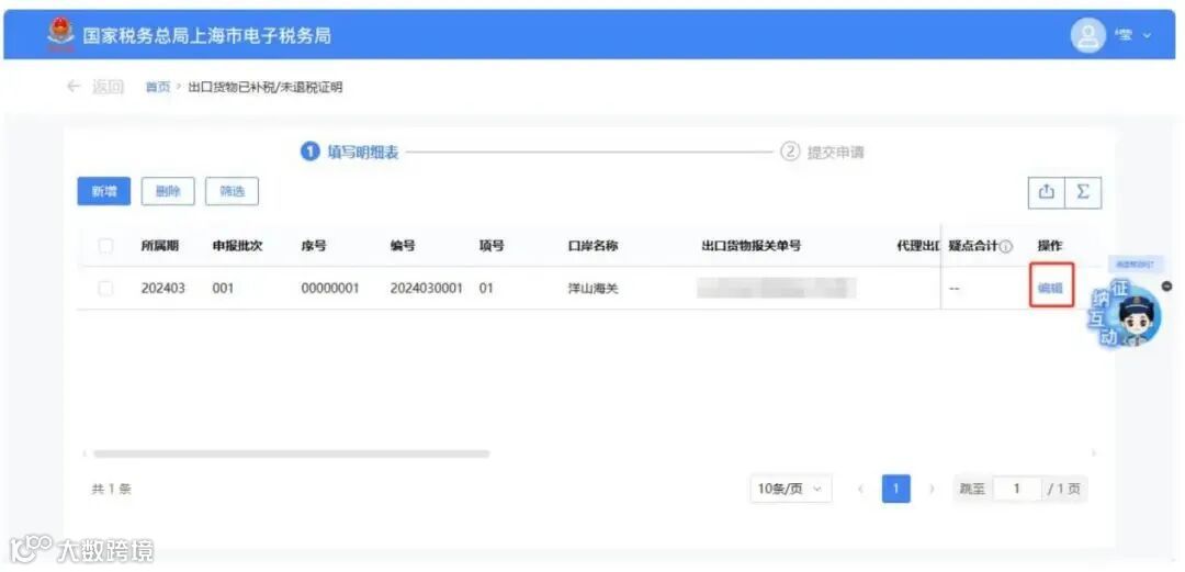 需要修改信息时,点击明细数据对应的【编辑】按钮,弹出“出口货物已补税/未退税证明编辑”页面,可对已采集的数据进行修改。