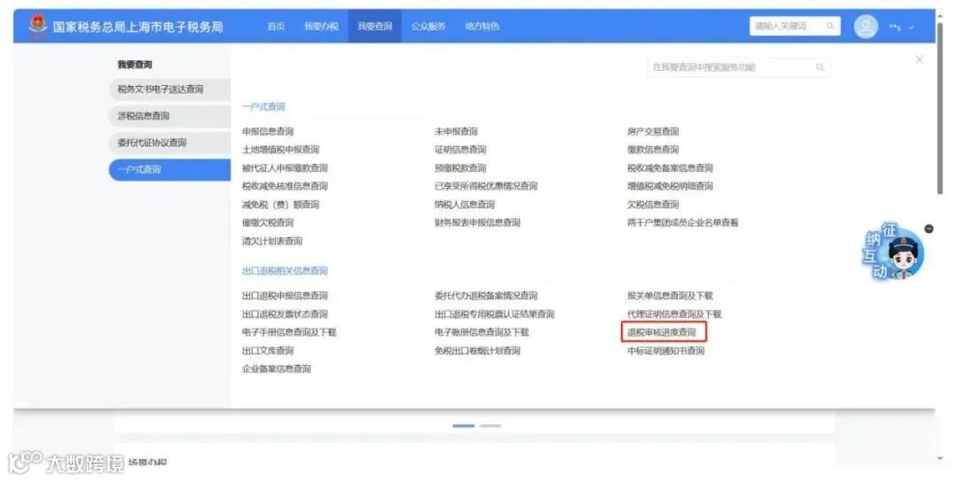 登录新电子税局后,点击【我要查询】-【一户式查询】-【出口退税相关信息查询】-【退税审核进度查询】功能菜单。