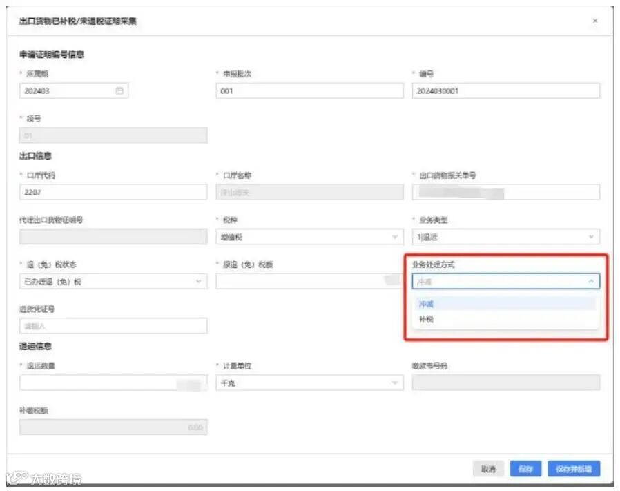 如该出口货物报关单已办理退(免)税,则需填写原退(免)税额、业务处理方式、进货凭证号等信息,业务处理方式为“冲减”或“补税”。